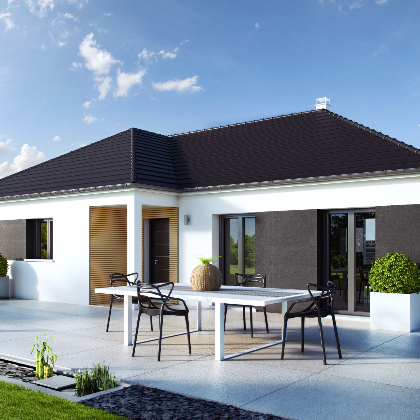 Disponible dans des dimensions allant de 90 à 130 m², c’est un modèle de plain-pied qui va vous faire craquer. Un joli toit en tuile traditionnel et des lignes plus contemporaines pour le garage accolé, cette maison en L sobre et élégante a un charme fou. Vous en voulez davantage ? Des nuances bicolores sur les façades, une porte protégée des intempéries vous la feront aimer encore plus. Et ses nombreuses portes-fenêtres, laissant généreusement entrer la lumière dans votre intérieur, finiront de vous convaincre que c’est ce modèle qu’il vous faut. N’hésitez pas, demandez-nous tous les détails !